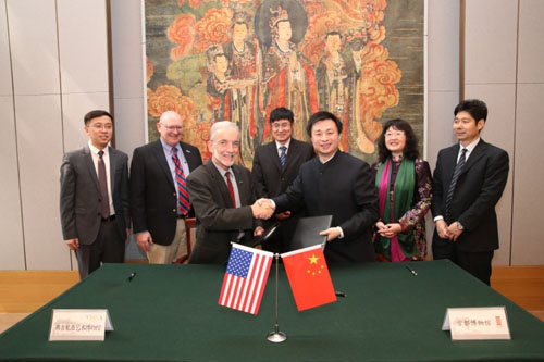 双方就未来加强两馆交流与合作,促进中美文化交流等事宜深入交换意见,并签署了两馆合作框架协议。会后,来宾参观了《走进养心殿》、《馆藏京剧文物展》、《古代瓷器艺术精品展》和《古代佛像艺术精品展》。