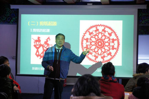 徐老师讲课生动而不失严厉,他向大家介绍了剪纸的起源和发展历史,讲述了剪纸的作用、新年剪纸种类、中国历史上最早的剪纸、剪纸的基本方法等。家长和孩子们聚精会神地边听边记录,积极踊跃地回答他提出的问题。在动手实践环节中,徐老师先从如何拿剪刀开始示范,在他的指导和带领下,大家学习了寿桃、蝴蝶图案的剪纸。