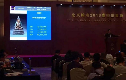 近日,北京翰海2016春季拍卖会落下帷幕,15个专场均顺利结束。鉴于市场现状,翰海公司在本届拍卖会的征集、筹备阶段,将拍品的数量进行压缩,特别是高估价拍品的数量大幅缩减,八成左右拍品估价在数十万以内区间,推出“瓮漉溪渔—海外回流中国书画”无底价专场,“小雅观心—插画、宣传画及油画雕塑”专场也有半数拍品收入“无底价单元”,翰海此季春拍整体定位低调,又恰逢北京拍卖集中举行阶段,总成交3.8亿元,整体较为平稳。其中,重要拍品依然表现突出,宫廷造像精品“清乾隆 铜泥金 弥勒菩萨”,经过激烈竞拍最终以983.25万元成交,为古董珍玩专场带来精彩的一幕。