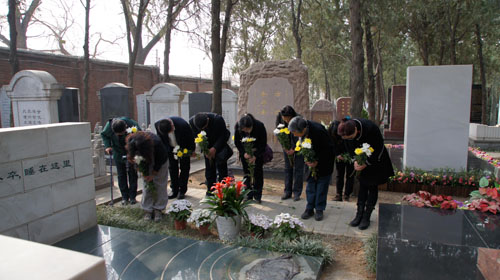 清明节即将到来之际,老舍纪念馆全体工作人员来到八宝山革命公墓开展纪念老舍先生活动,一同前往的还有老舍纪念馆荣誉馆长、老舍先生的女儿舒济先生。活动中,全馆同志在老舍先生幕前默哀并鞠躬致敬,纪念馆职工代表朗读了《清明节纪念老舍先生》的文章,表达了老舍纪念馆全体同志的缅怀之情,全馆人员依次向老舍先生的幕地敬献了鲜花。悼念活动结束后,舒济先生还为大家介绍了老舍墓地设计与落成前后的情况。