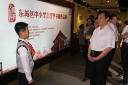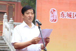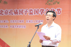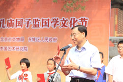 上午9时,参加开幕式的嘉宾在工作人员的引导下步入开幕式主会场,欣赏了排列在会场两侧的东城区中小学生国学书画大奖赛优秀获奖作品。9时30分,开幕式主持人、东城区副区长朴学东宣布开幕式正式开始。东城区委副书记、区长牛青山和北京市文物局局长舒小峰分别为第四届北京孔庙•国子监国学文化节开幕致辞。