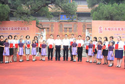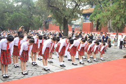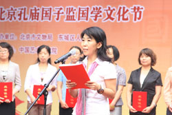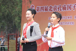 此次国学文化节的开幕正值第29个教师节来临之际,开幕式上,特意安排了“教师节拜师仪式”,与会领导首先为获得北京市优秀教师和东城区教育标兵的教师代表,以及东城区中小学国学书画大奖赛获奖学生颁奖。随后,来自东城区教育系统的10名优秀教师代表和60名学生代表走上台,师生共向孔子像行敬师礼。而后学生们向优秀教师行鞠躬礼,并为老师们奉上鲜花送上感谢与祝福,充分体现出中华民族尊师重教的传统美德。开幕式最后,东城区委书记杨柳荫隆重宣布:第四届北京孔庙•国子监国学文化节正式开幕。