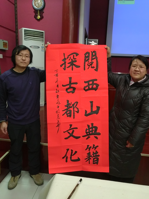 讲座后,邹老师进行了现场春联书写表演。飘着墨香的春联,给大家送去了新春的祝福。