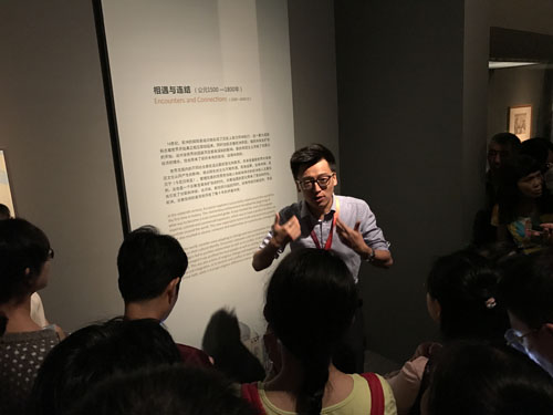 张鹏用了2个多小时的时间,详细介绍了这100件文物的年代、历史背景、所承载的关于不同文明之间交流与碰撞的信息,以时间为经、地域为纬,勾画出200万年来的世界史。张鹏的讲解是对“大英展”的升华,旁征博引又娓娓道来的精彩讲述不仅深深吸引了参加活动的青年业务人员,有许多观众也驻足聆听,结束后纷纷要求与张鹏合影留念。张鹏也介绍了参观博物馆展览不能沉浸于文物本身,要抽身出来思考策展人布展的用意,纵观全展会对展览有更透彻的认识。