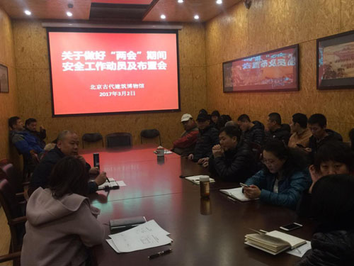 北京古代建筑博物馆召开关于“两会”期间安全工作动员部署会议。会议结束后各部门进行自查,并将自查结果以书面形式上交保卫科。再由保卫科对全馆进行细致的安全检查,对不合格的区域通知负责人进行整改,确保“两会”期间古建馆的安全。