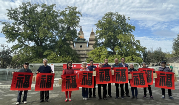 海淀区政协委员、书法家刘宝柱现场写“福字 寿字”,在场的领导嘉宾给老人送“福”“寿”。同时,领导们还将石刻馆院里结的柿子,送给老人,寓意“福寿延年,事事如意”。