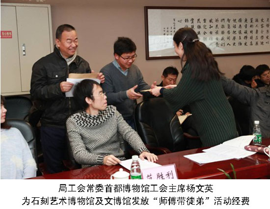 为进一步落实《首都职工素质建设工程方案》,提高职工岗位技能水平,强化技能人才的荣誉感和工匠精神,以及体现工会组织服务职工、服务文博工作的服务职能,2016年12月16日,北京市文物局工会“师傅带徒弟”活动,在首都博物馆正式启动。局属22家单位工会主席及首批10对“师徒”共计50人参加了启动仪式。北京市文物局工会专职副主席张德华主持了启动仪式并代表局工会讲话。