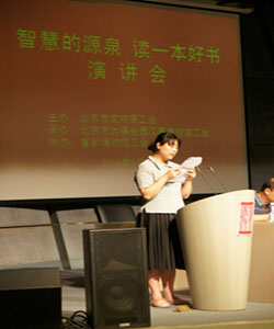 由北京市文物局工会主办、北京市大葆台西汉墓博物馆承办的,“智慧的源泉 ”——“读一本好书”读书心得东区演讲展示活动,于2014年9月10日下午在 首都博物馆举行。来自首都博物馆、老舍纪念馆、文博交流馆、正阳门管理处、文物公司的近四十多名职工, 参加了演讲展示活动,6位优秀读书心得作者现场演讲自己的读书心得。 北京市文物局副巡视员、工会常务副主席田淑芳同志到场并讲话。张德华副主席主持 了演讲展示活动。