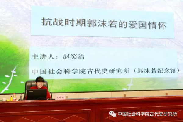 开幕式后,赵笑洁应邀在“凉州讲坛”做了题为《抗战时期郭沫若的爱国情怀》的文化讲座,她从“独具审美内涵的史剧创作”“激越人心的公开演讲”“革命民主人士的战友情深”“入情入理的中国传统历史书写”等角度,讲述了郭沫若在抗战期间的卓越贡献,赞扬了郭沫若为争取民族独立而献身的爱国主义精神。并结合党史学习教育,回顾了郭沫若与中国共产党的密切关系和曲折经历,讲述了这位知识分子杰出代表的人生选择和杰出贡献。讲座还对郭沫若围绕武威出土的“王杖十简”和“铜奔马——马踏飞燕”等文物的学术研究、宣传推介以及与武威的文化渊源等进行了详细的介绍。武威市直文化系统干部职工代表、武威职业学院师生代表共220多人参加了展览开幕式和讲座活动。