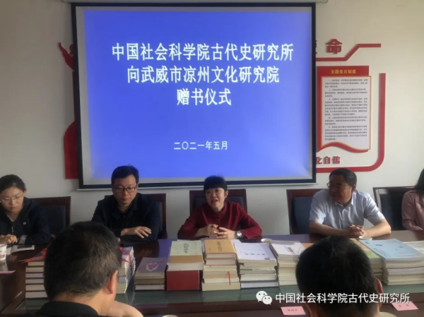 下午,中国社会科学院古代史研究所向武威市赠送图书仪式在凉州文化研究院举行。武威市政府副市长费生云出席赠书仪式。赵笑洁代表古代史研究所向武威市凉州文化研究院党组书记、院长张国才,副院长席晓喆赠送图书。此次古代史研究所全体职工共向凉州文化研究院赠送了2258册专业研究书籍,中国历史研究院图书档案馆向凉州文化研究院捐赠期刊630种6258册。