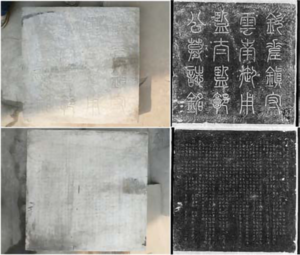 买地券砖1块(图三):边长50厘米。古代置于墓中的地契。用石、砖、铁、木等刻写。内容是记死者所买墓地的四至、价钱、证人和不许侵占等语。买地券、镇墓文是东汉中后期出现的具有鲜明道教文化特征的随葬文字材料,是一种象征性的证券,放在墓内意在保证死者对墓地的所有权不可侵犯。此砖因文字不清。尚无法断定是否与墓志同期埋葬之物。