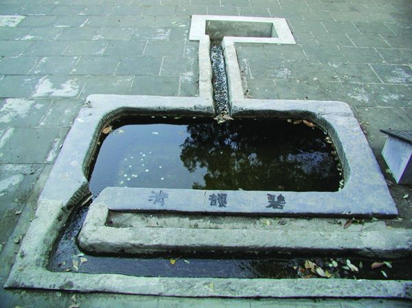 在大觉寺北路有一方奇石,这块奇石其实也是一个池子,名叫“碧韵清池”。碧韵清池是由一整块天然大理石精雕细琢而成,池的西沿刻有“碧韵清”三字,字体古朴,苍劲有力。“碧”是形容泉水汇聚池中时所形成的碧绿颜色,当年池旁曾栽有一棵樱桃树,在浓郁的树荫底下池水呈现出碧绿的色泽。“韵”是水流入流出时发出的声响,池的东西两沿各有进水口和出水口,泉水从出水口流出时与一个小方池形成高低落差,发出富有韵律的声音。“清”是形容池子的功能,沿石渠顺山势蜿蜒而下的泉水由于露天流淌,加之石渠久经风雨侵蚀逐渐变浅,从山上流下的泉水常常夹带着一些落叶泥沙顺流而下,泉水在流经此池时,由于池深、水缓,泥沙逐渐沉淀,池子就起到了过滤沉淀的作用,从出水口流入功德池中的泉水又变得清澈透明了。