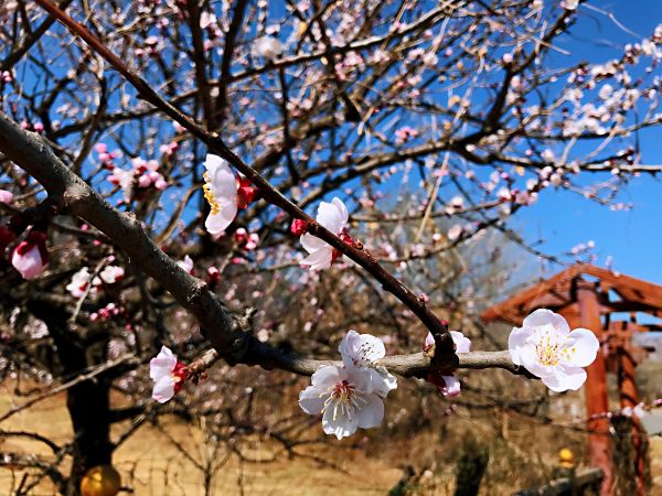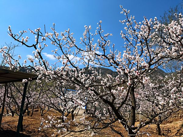 走过一个石山顶才到了平地,一条又小又弯的路带着我们走进大觉寺的山脚下。两旁全是杏树林,一直到山顶,除了一条羊肠小路只容得一个人行走以外,简直满都是树。这时候正是五月里杏花盛开的时候,所以远看去简直像是一座雪山,走近来才看出一朵朵的花,坠得树枝都看不出了。
