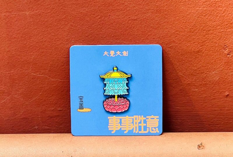 产品简介:本系列徽章图案提取自大觉寺大殿天花彩画中的八宝装饰纹样。八宝寓意吉祥,是我国传统工艺中的主要纹饰。本系列产品每款代表不同寓意和吉祥祈福的象征意义,以美好祝愿的方式出现在观众游客的生活中。