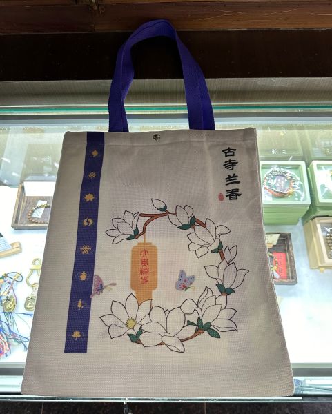 产品简介:帆布袋以大觉寺玉兰盛开场景为原型,进行绘制,飘带上画了佛家八宝图案。帆布袋以大觉寺匾额书法为原型,让游客把佛理名言带回家。