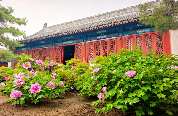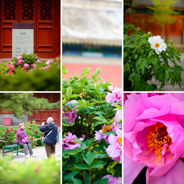 近日,大钟寺古钟博物馆内,观音殿南侧的数十株牡丹已陆续进入盛花期,满园春色,无比绚烂。市民游客纷纷在花间合影留念,尽享绚丽。