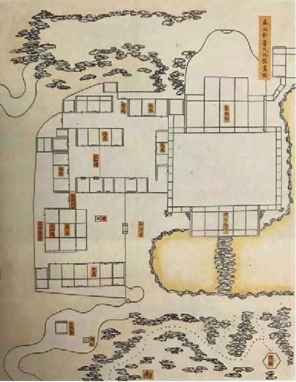 乾隆二十年(1755),对杏花春馆景区进行了改建,去掉了菜圃,在东南山口处开辟水渠与后湖相连,将湖水引入到低洼的小山谷,形成了蜿蜒曲折的“上”字形水面,既营造了景观意境,也利于引水灌溉和自然排水。又新添春雨轩、杏花村等景观,早期的菜园小圃、疏篱茅舍已不见踪影,乡野村落气息渐渐淡去。据史料可知,自胤禛赐园到1860年被焚毁,杏花春馆经历了多次调整,其中规模最大的一次则是乾隆二十年,此后杏花春馆整体格局基本稳定下来(图二)。“乾隆三十四年,又在春雨轩后堆叠山石高峰,成为后湖周围山体的最高峰,改变了景区的山水格局。至此景区已经没有以往的山野村落景象,而成为一处完整的园林,不但有主要的厅堂,还有次要的附属用房,山水主次分明,自成一体,形成一处具有差序格局的建筑群,从此也可以看出乾隆与雍正不同的追求”⑧。雍正时期,杏花春馆还是一处朴实自然、充满田园乐趣的景观,比较接近传统的文人园林。乾隆中期改建之后,增加了皇家园林色彩和气派。这也符合雍正清雅、乾隆华丽的审美品位。